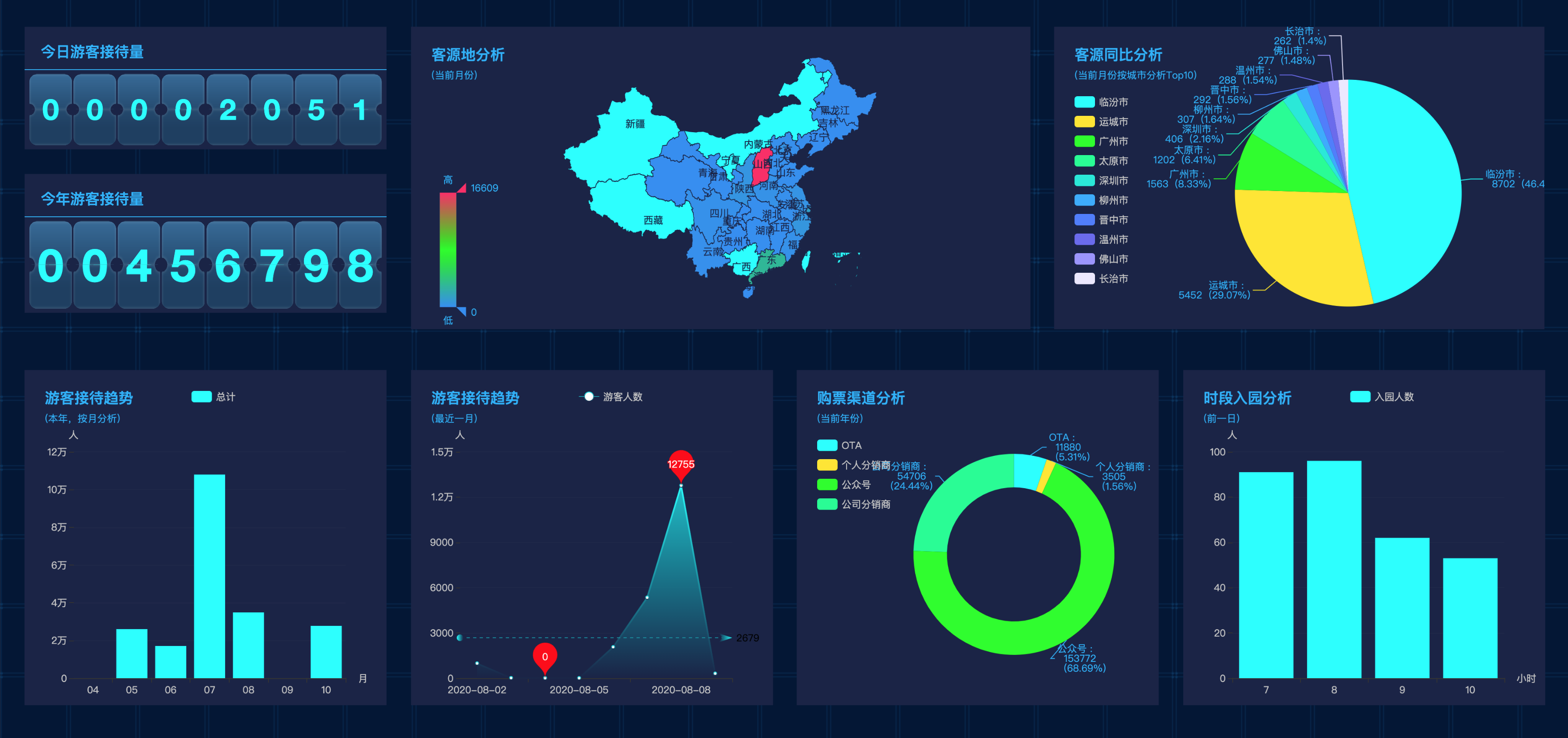 對接客流統計攝像頭,將拉取出的客流數據進行展示、分析,對進出入景區的人數數據進行管理,可以獲取當前在園人數、入園人數與離園人數,為數據中心提供景區客流數據信息。
